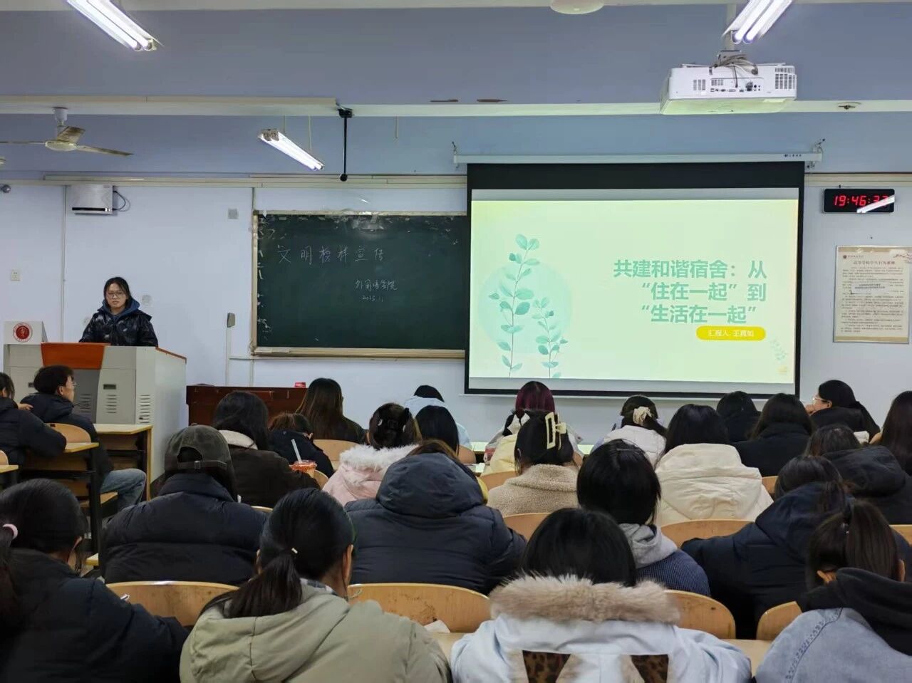 此次校园文明宿舍榜样学习宣讲会,邀请了菊园五号楼109宿舍长王真如、117宿舍长林艳茹两位优秀宿舍长进行宣讲。宣讲内容围绕“理念引导+经验分享+实践落地”进行,既为宿舍文明建设提供了青年视角的实践参考,也通过同龄人的真实体验强化了文明宿舍理念的传播力。