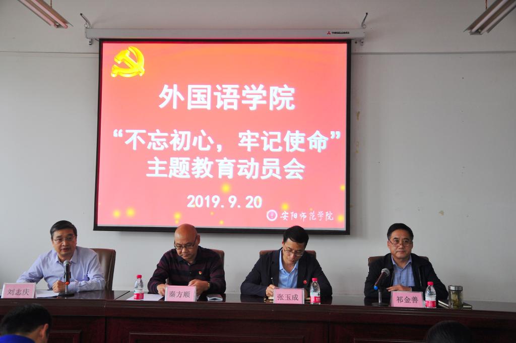 9月20日下午,外国语学院在逸夫楼1121会议室召开“不忘初心、牢记使命”主题教育动员部署会。校第二巡回指导组组长秦方顺出席会议并讲话,学院党委书记刘志庆作动员讲话,院长祁金善主持会议,校第二巡回指导组成员张玉成、学院全体教师学生党员参加会议。
