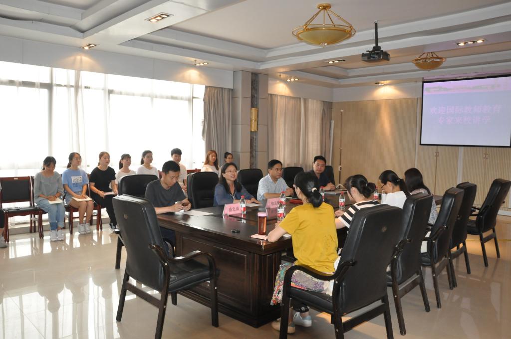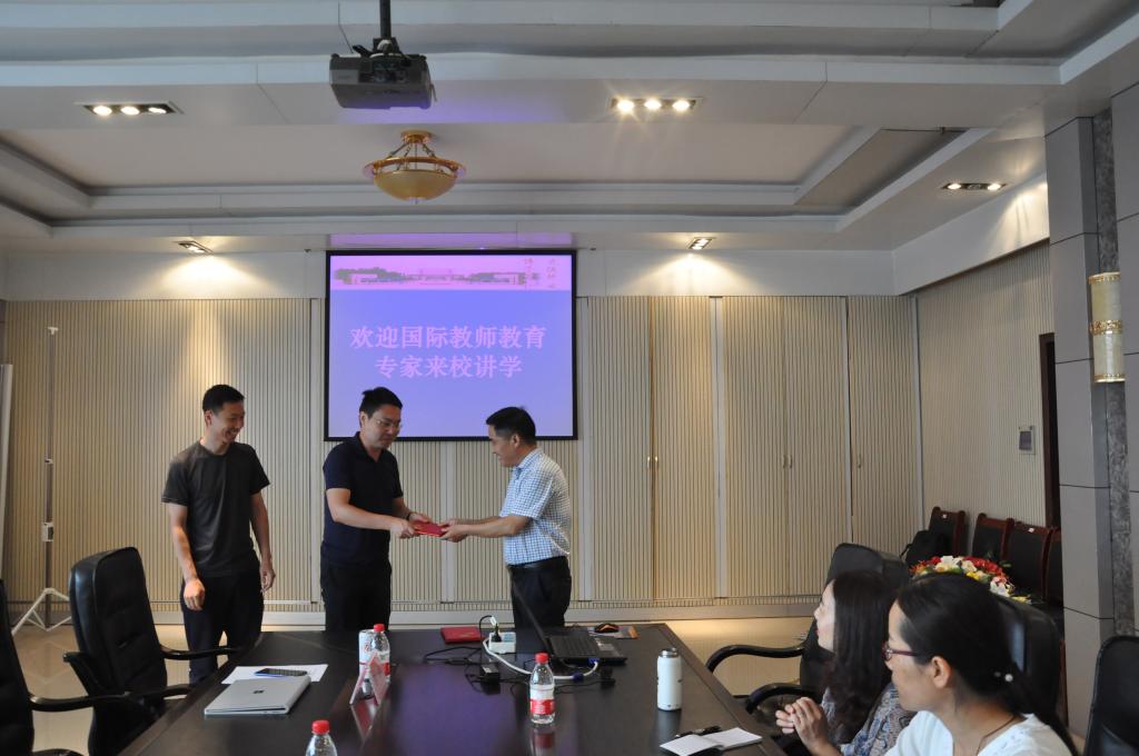 7月22日-23日,国际教师教育学院邀请国际教师教育教学专家来校开展系列讲座活动,本次系列讲座邀请到的专家为北京优易教育咨询有限公司总裁谢涛先生和唐山东方国际教育集团校长盛忠诚先生。讲座前,国际教师教育学院院长祁金善教授接见了两位专家,并为两位专家颁发了校外导师聘书。讲座由徐志敏副院长主持,国教16、17级学生和部分国教授课教师参加了讲座。