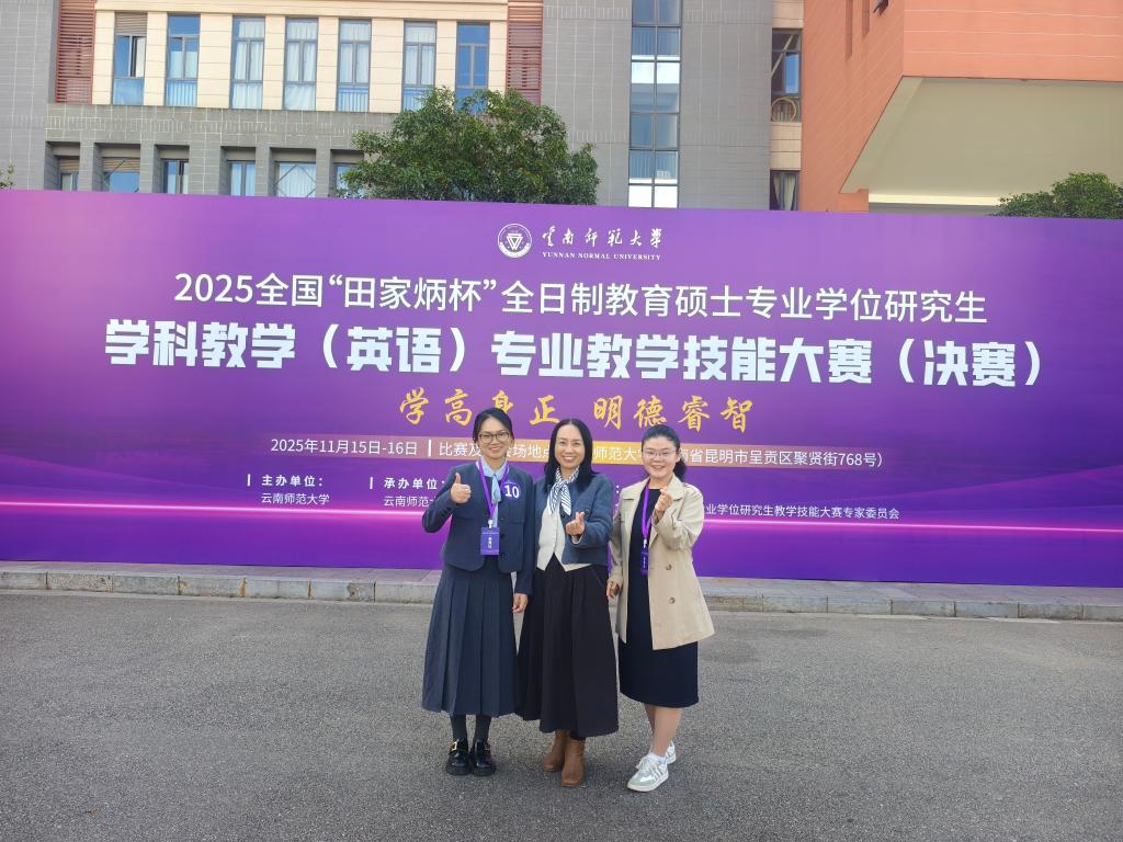 近日,由田家炳基金会主办、云南师范大学承办的2025年“田家炳杯”全日制教育硕士专业学位研究生学科教学(英语)专业教学技能大赛(决赛)顺利闭幕。我院2024级学科教学(英语)专业硕士研究生王慧杰、莫银燕凭借扎实的专业基础、创新的教学设计以及出色的现场表现,荣获大赛三等奖,充分彰显了我院研究生培养的卓越成效以及学子的良好形象。