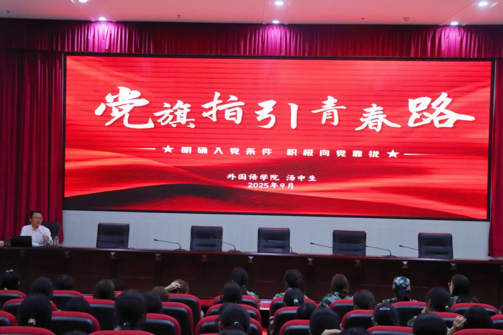9月25日晚,外国语学院以“党旗指引青春路”为主题,在文博楼二楼会议室开展2025级新生入学教育——理想信念教育和入党启蒙教育,外国语学院党委书记汤中生担任主讲,辅导员樊晨飞、胡依婷和2025级全体新生参加。